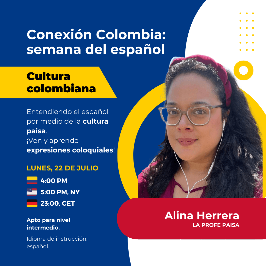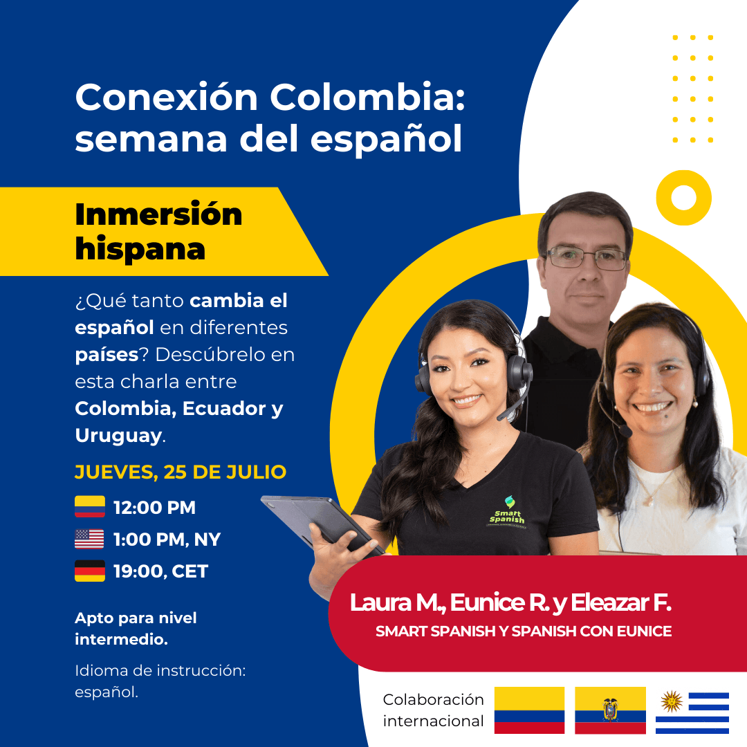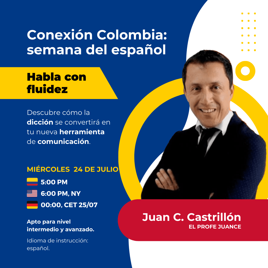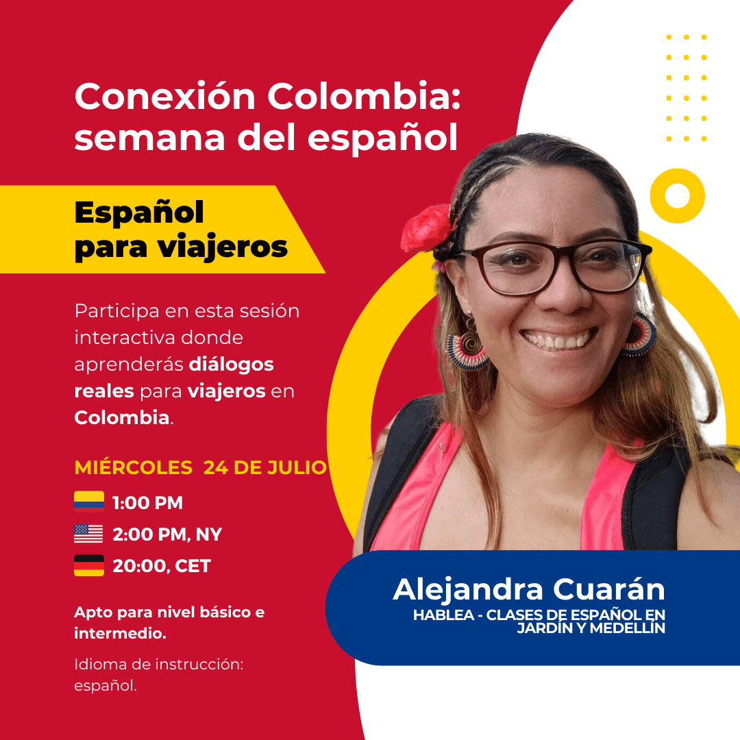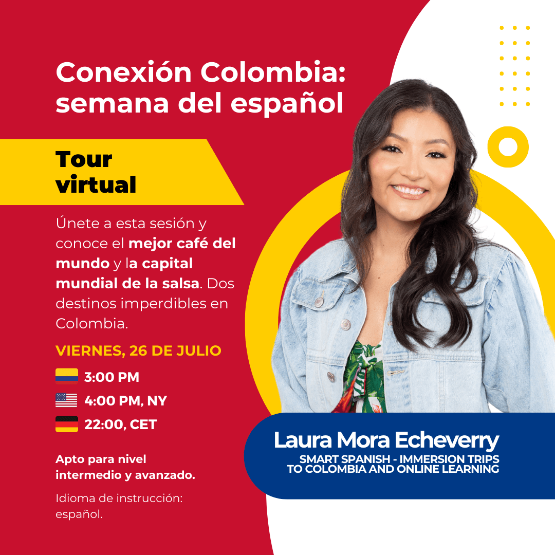Únete a nosotros del 22 al 26 de julio para disfrutar de "Conexión Colombia: Semana del Español", una feria virtual repleta de actividades fascinantes para todos los interesados en Colombia y en aprender español. Prepárate para participar en masterclasses, charlas culturales, tours virtuales y escuchar testimonios de estudiantes, todo desde la comodidad de tu hogar. Este evento es una oportunidad única para conectar con la vibrante cultura y el idioma de Colombia. ¡Te esperamos con los brazos abiertos!