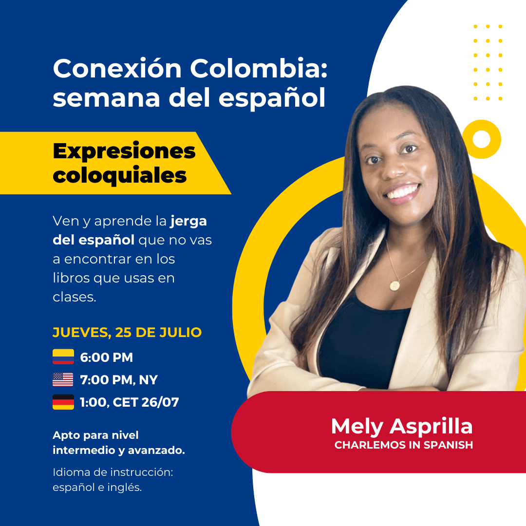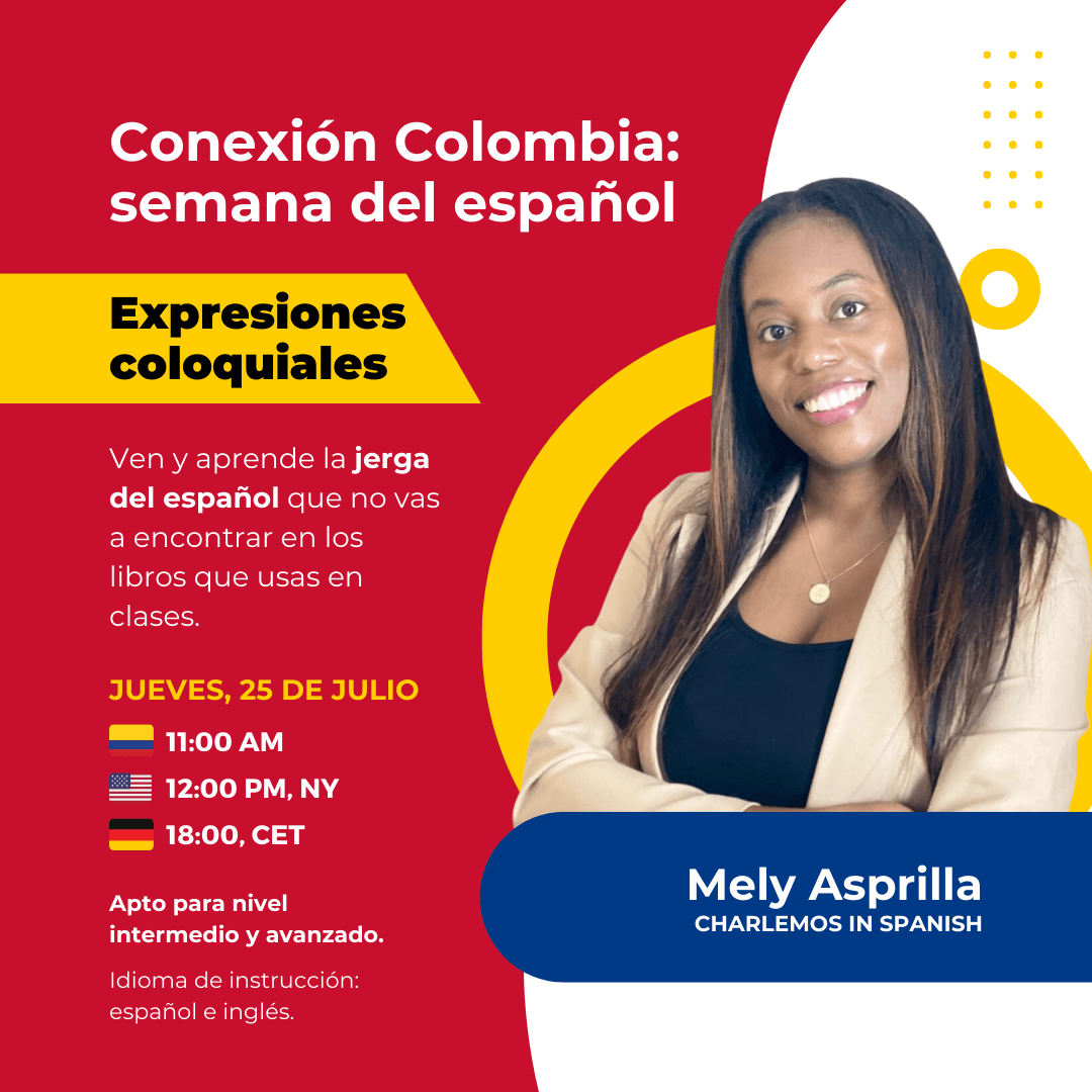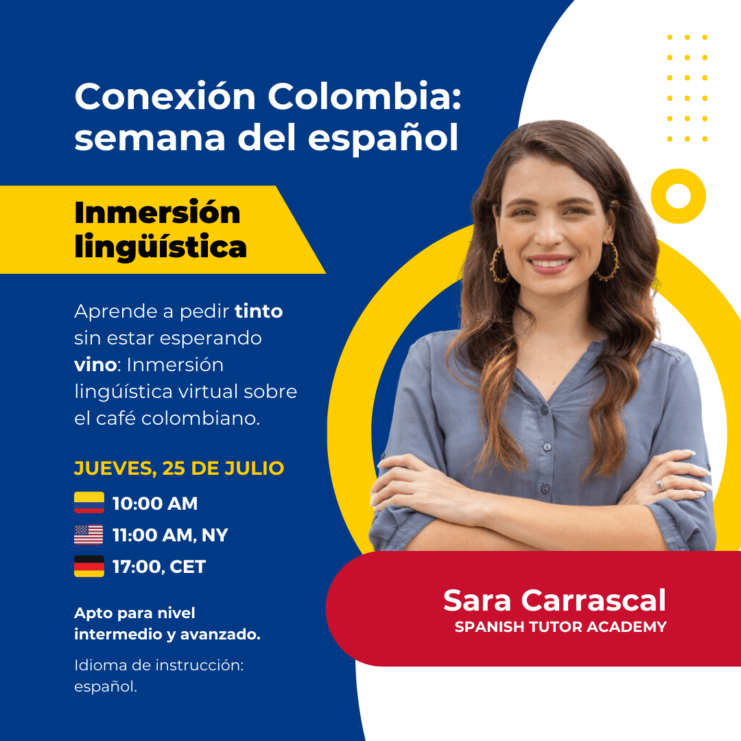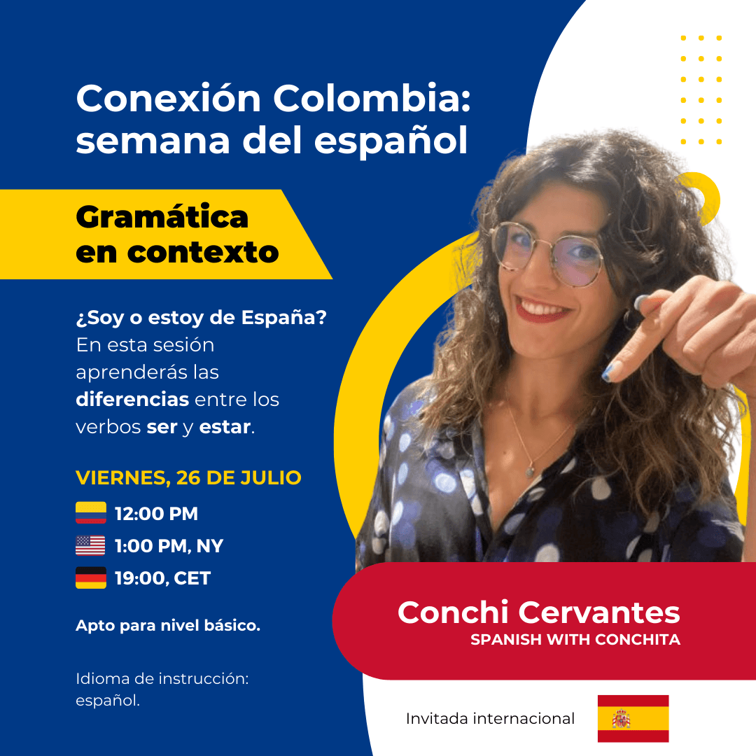Únete a nosotros del 22 al 26 de julio para disfrutar de "Conexión Colombia: Semana del Español", una feria virtual repleta de actividades fascinantes para todos los interesados en Colombia y en aprender español. Prepárate para participar en masterclasses, charlas culturales, tours virtuales y escuchar testimonios de estudiantes, todo desde la comodidad de tu hogar. Este evento es una oportunidad única para conectar con la vibrante cultura y el idioma de Colombia. ¡Te esperamos con los brazos abiertos!