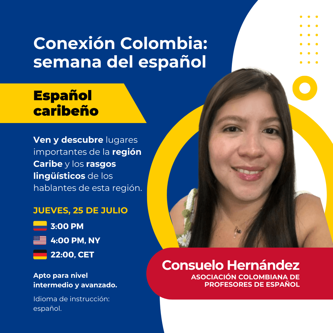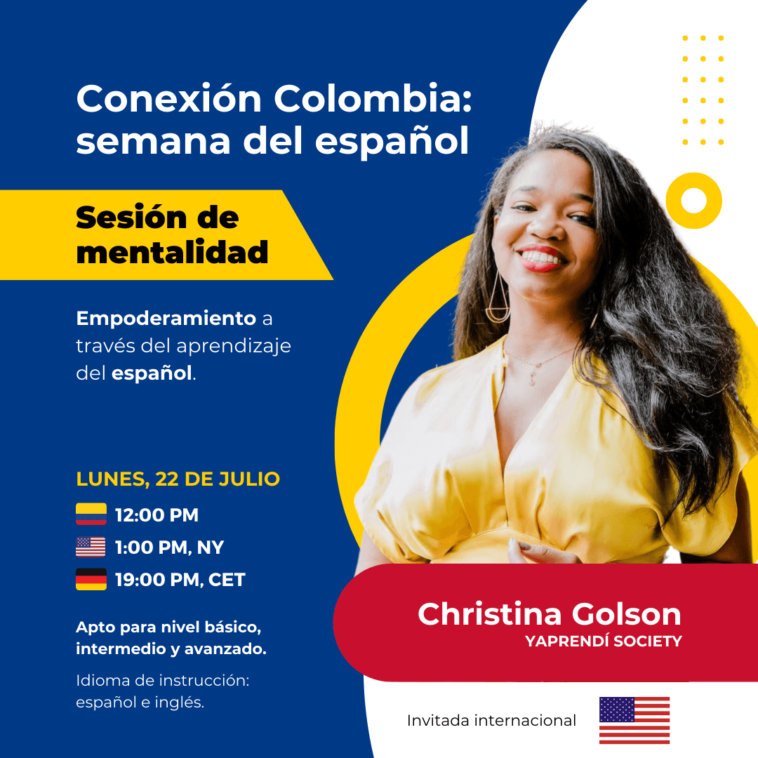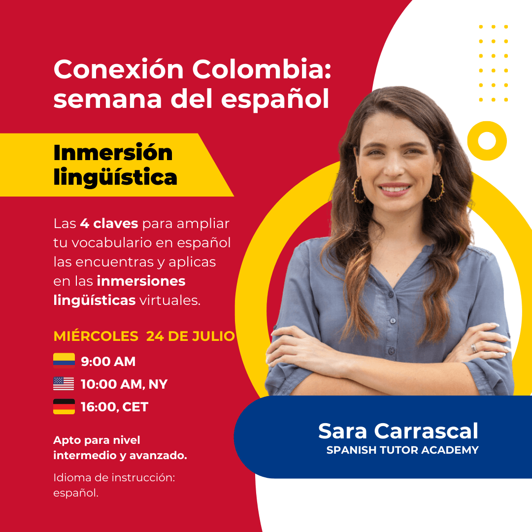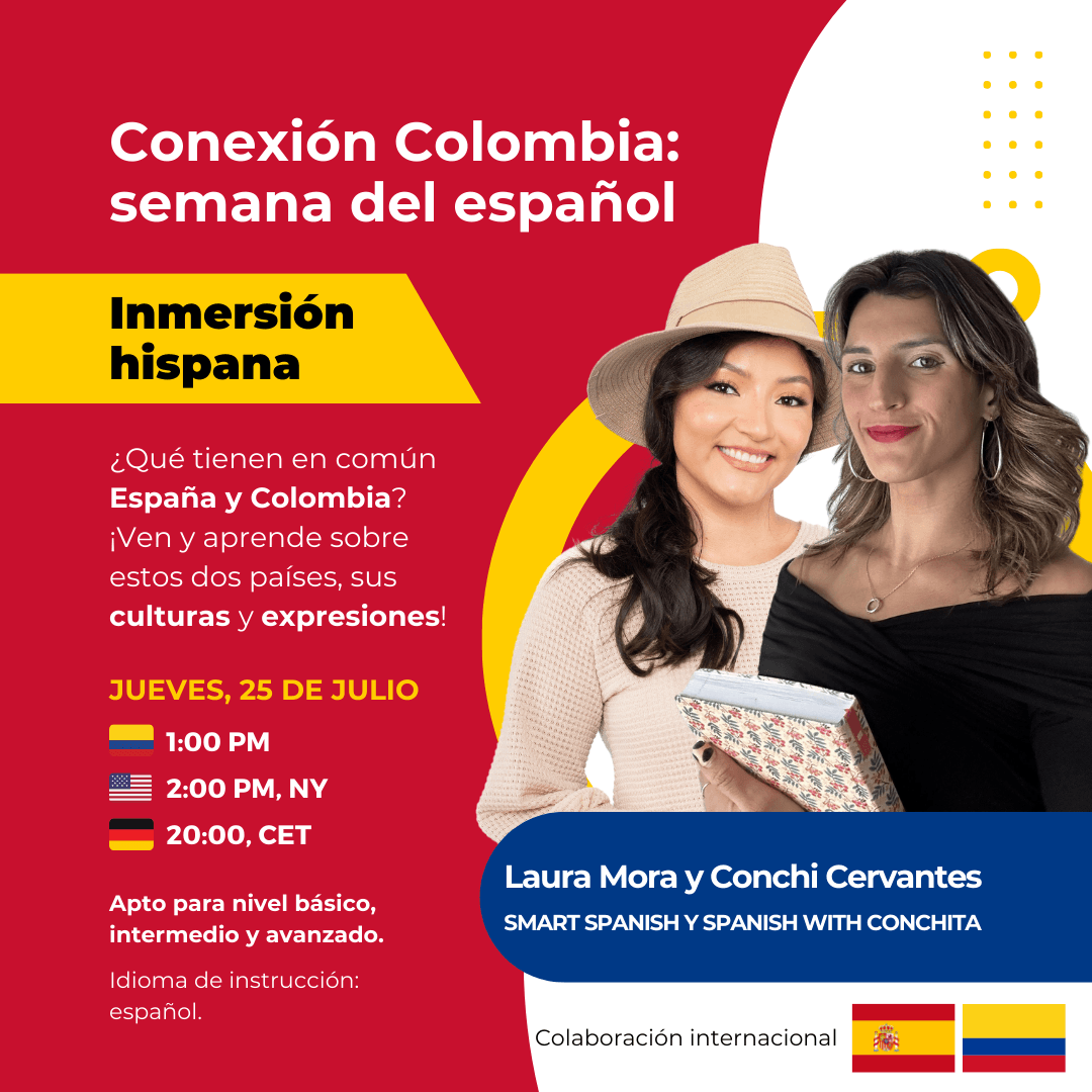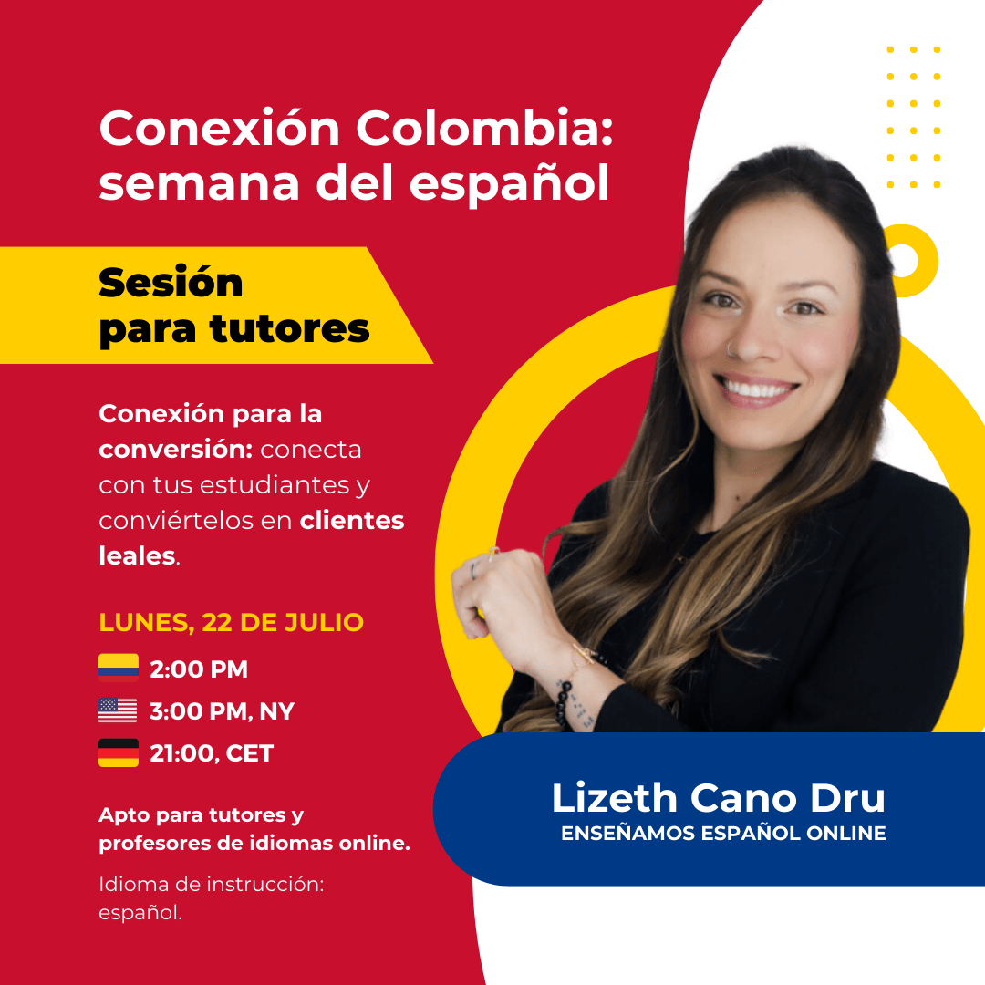 Únete a nosotros del 22 al 26 de julio para disfrutar de "Conexión Colombia: Semana del Español", una feria virtual repleta de actividades fascinantes para todos los interesados en Colombia y en aprender español. Prepárate para participar en masterclasses, charlas culturales, tours virtuales y escuchar testimonios de estudiantes, todo desde la comodidad de tu hogar. Este evento es una oportunidad única para conectar con la vibrante cultura y el idioma de Colombia. ¡Te esperamos con los brazos abiertos!