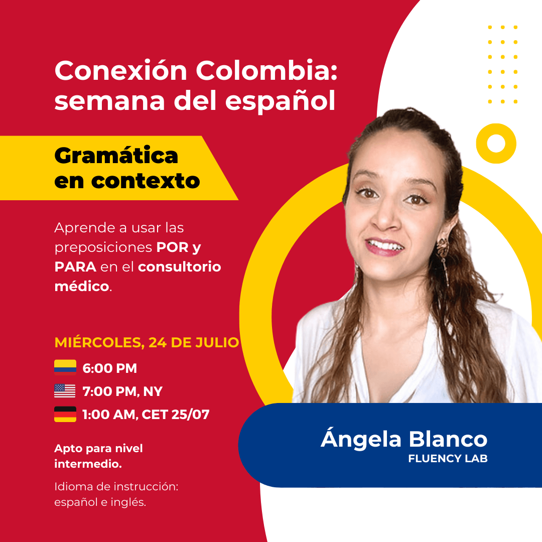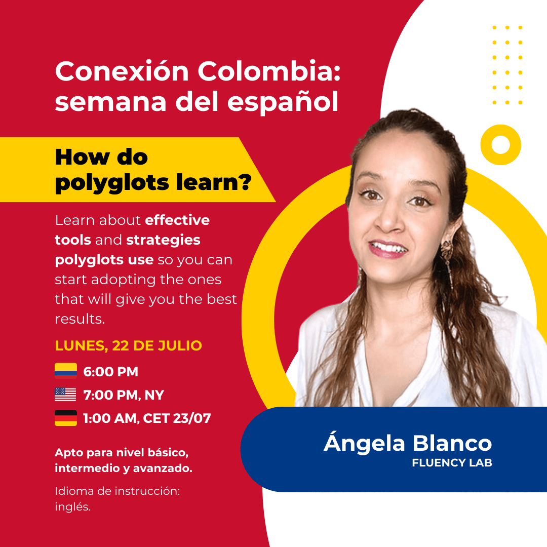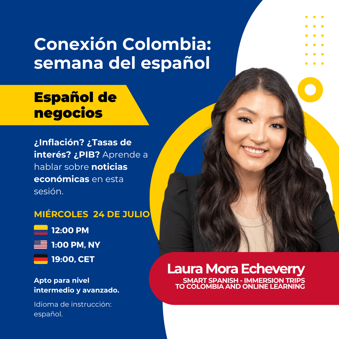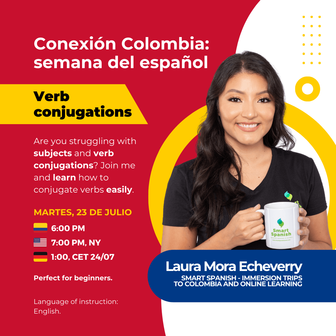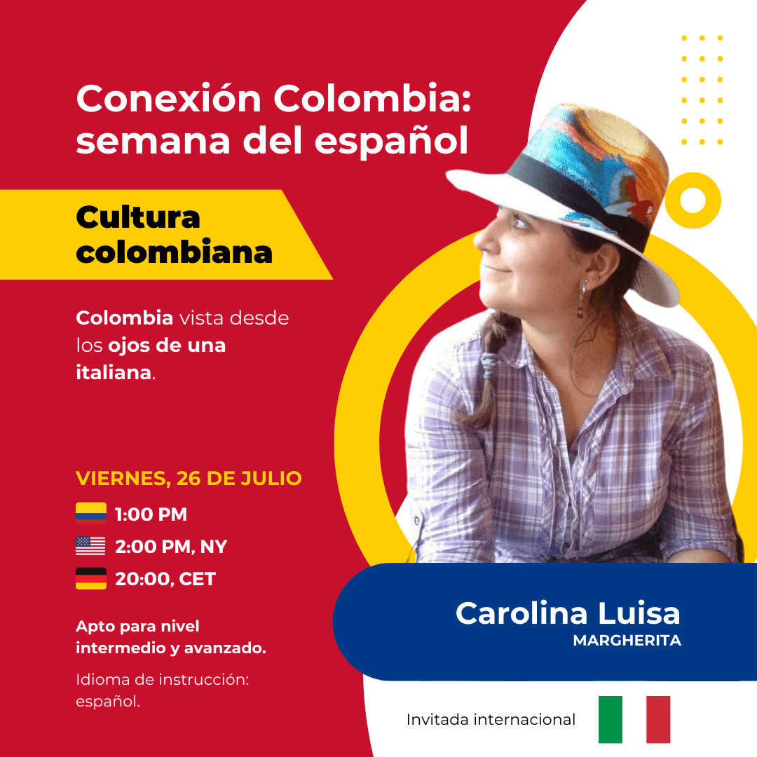 Únete a nosotros del 22 al 26 de julio para disfrutar de "Conexión Colombia: Semana del Español", una feria virtual repleta de actividades fascinantes para todos los interesados en Colombia y en aprender español. Prepárate para participar en masterclasses, charlas culturales, tours virtuales y escuchar testimonios de estudiantes, todo desde la comodidad de tu hogar. Este evento es una oportunidad única para conectar con la vibrante cultura y el idioma de Colombia. ¡Te esperamos con los brazos abiertos!